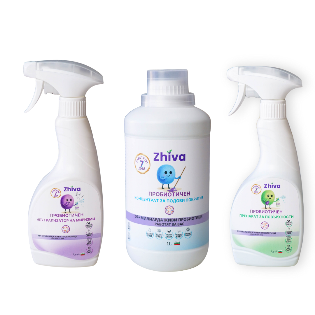 Единствената пробиотична формула за повърхности в България, която почиства в дълбочина и защитава до 7 дни. Zhiva пробиотичен универсален препарат за повърхности премахва органични замърсявания и неприятни миризми, като създава защитен пробиотичен филм. Безопасен, ефективен и екологичен – за дълготрайна чистота у дома.
